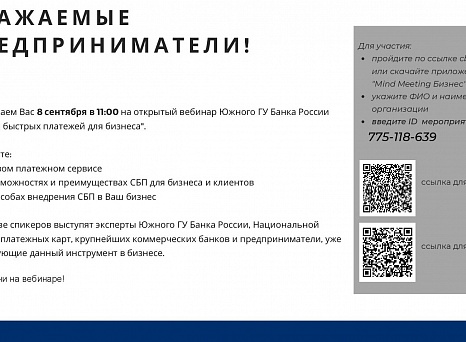 Уважаемые предприниматели! Отдел по инвестициям и малому бизнесу приглашает вас 8 сентября 2021 года в 11:00 на открытый вебинар Южного ГУ Банка России «Система быстрых платежей для бизнеса».